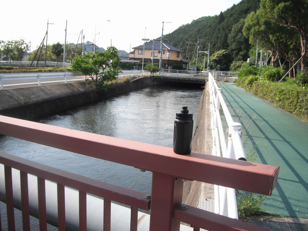 橋の欄干にボトルを置いて、スマホを立てかけて写真を撮ります。